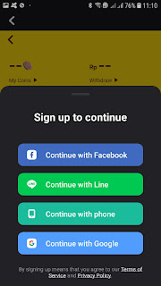 7. Pilih salah satu metode pendaftaran, bisa menggunakan akun Facebook (FB), Akun Line, Nomor HP atau akun Google, dalam pendaftaran ini saya menggunakan akun Facebook jadi tekan pada Continue with Facebook
